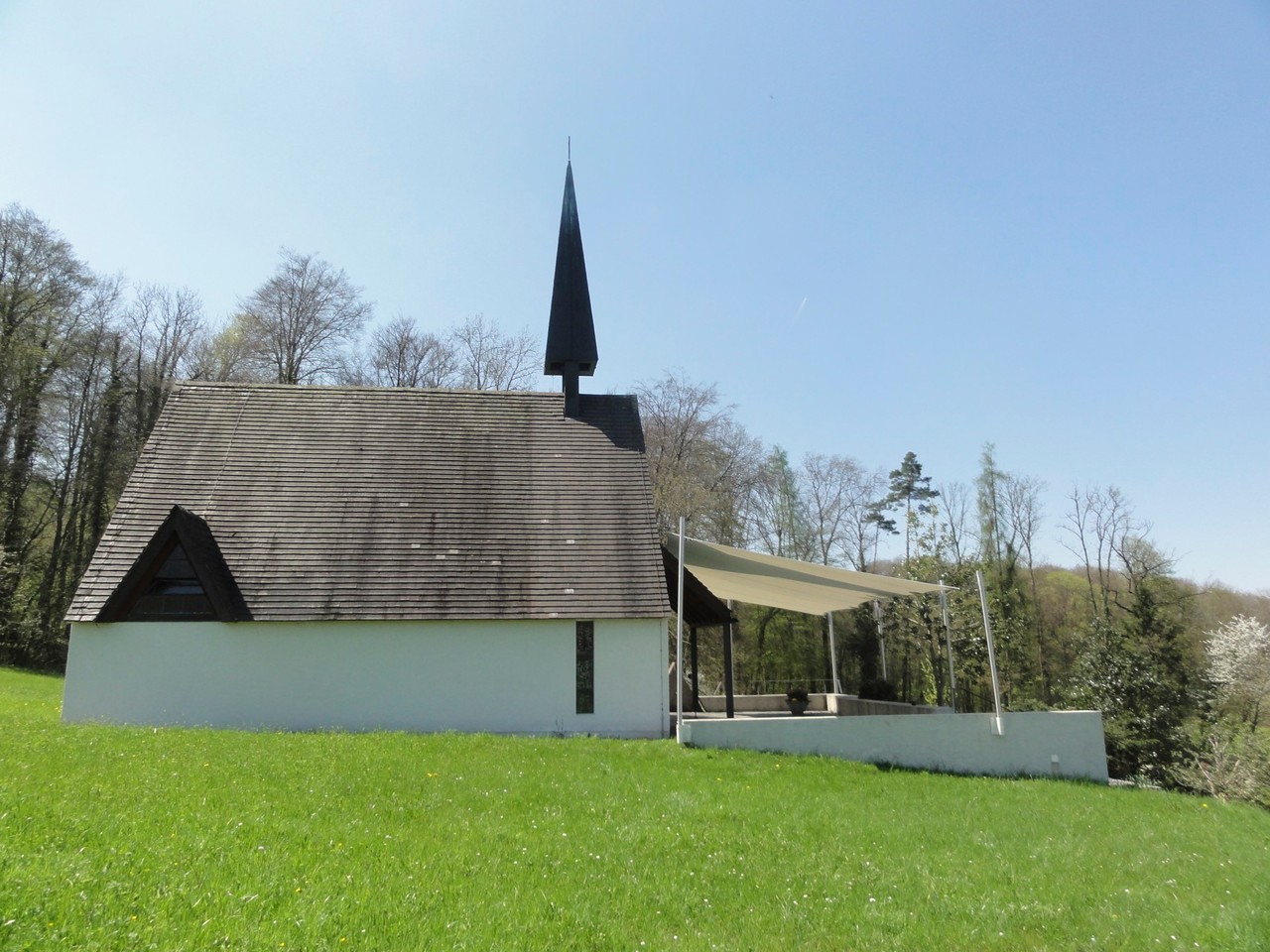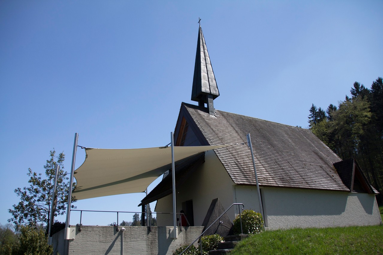 Auf vielseitigen Wunsch haben wir in der Bruderklausen-Kapelle nun ein Vordach anfertigen lassen. Der gesamten Aussenplatz/Vorplatz ist im Sommer mit einem grosses Regen- und Sonnendach gedeckt. (sehen Sie hier ein Video, wie das Regen- und Sonnendach aufgestellt wird.)